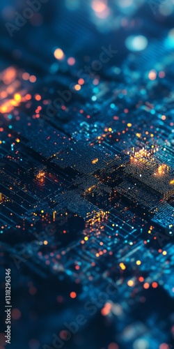 Wall mural : Close-up view of abstract technology background with glowing particles and circuit design
