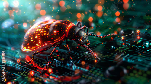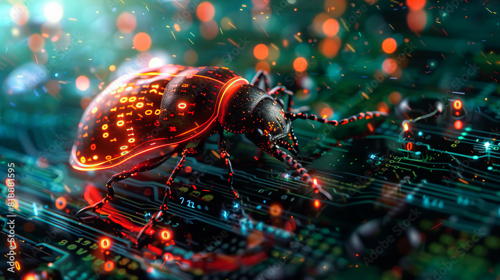 Wall mural : Close up view of computer bug perched on microchip symbolizing threat of software bugs and elusive v