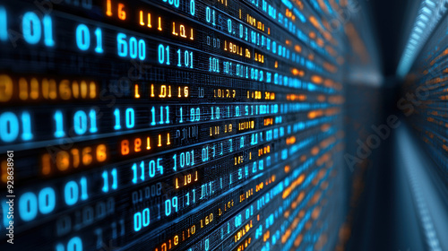 Wall mural : Close-up view of digital binary code on a screen with blue and orange lights, representing data stor
