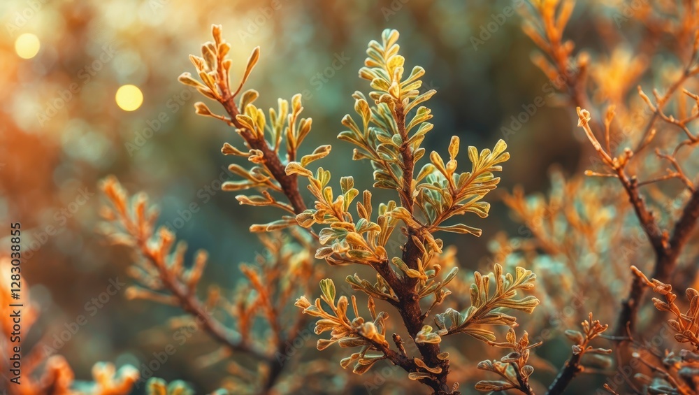 The watermark will not be included on Wall mural.: Close-up view of green foliage with blurred background and soft golden sunlight creating a warm atmo
