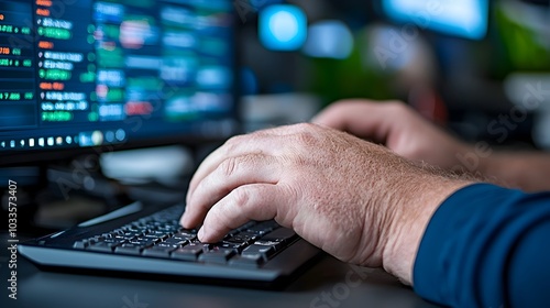 Wall mural close up view of hands typing financial data and market information into a digital trading terminal  - Wall murals Wall mural close up view of hands typing financial data and market information into a digital trading terminal - Wall murals