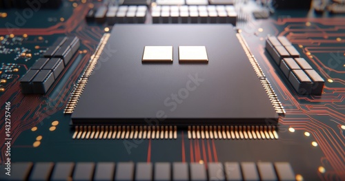 The watermark will not be included on Wall mural.: Close-up view of microchip on circuit board with electrical connectors