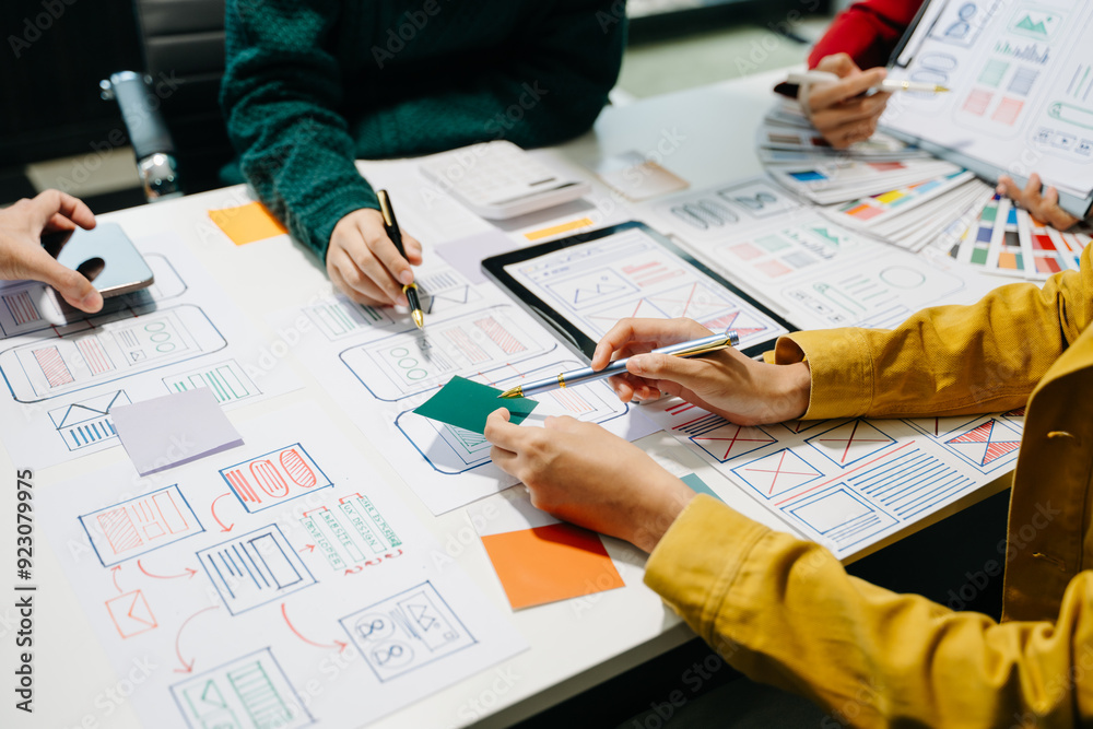 The watermark will not be included on Wall mural.: Close up view of ui developer team brainstorming on their project with laptop, smartphone and digita