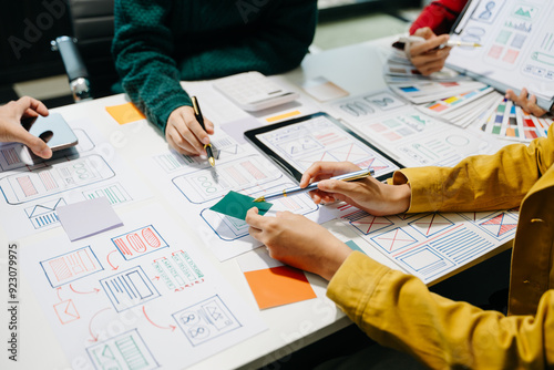 Wall mural : Close up view of ui developer team brainstorming on their project with laptop, smartphone and digita