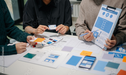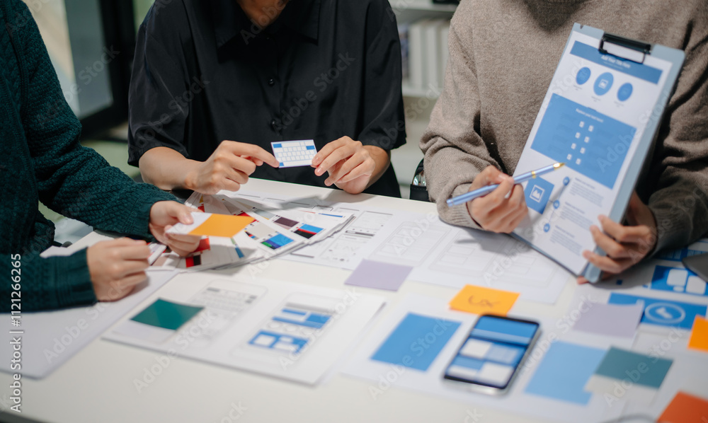 Wall mural : Close up view of ui developer team brainstorming on their project with laptop, smartphone and digita