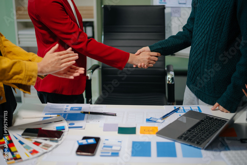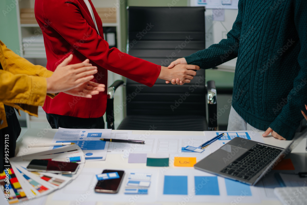 The watermark will not be included on Wall mural.: Close up view of ui developer team brainstorming on their project with laptop, smartphone and digita