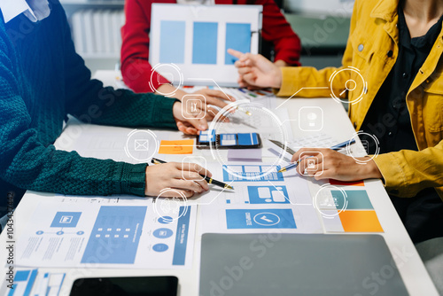 Wall mural : Close up view of ui developer team brainstorming on their project with laptop, smartphone and digita