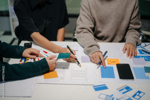 Wall mural : Close up view of ui developer team brainstorming on their project with laptop, smartphone and digita