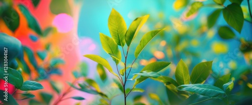 Wall mural : Close-up view of vibrant green leaves with colorful soft background bokeh effect in natural sunlight