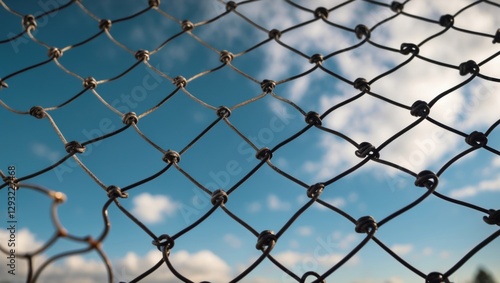 The watermark will not be included on Wall mural.: Close-up view of wire mesh against a bright blue sky with soft clouds creating a contrast between in