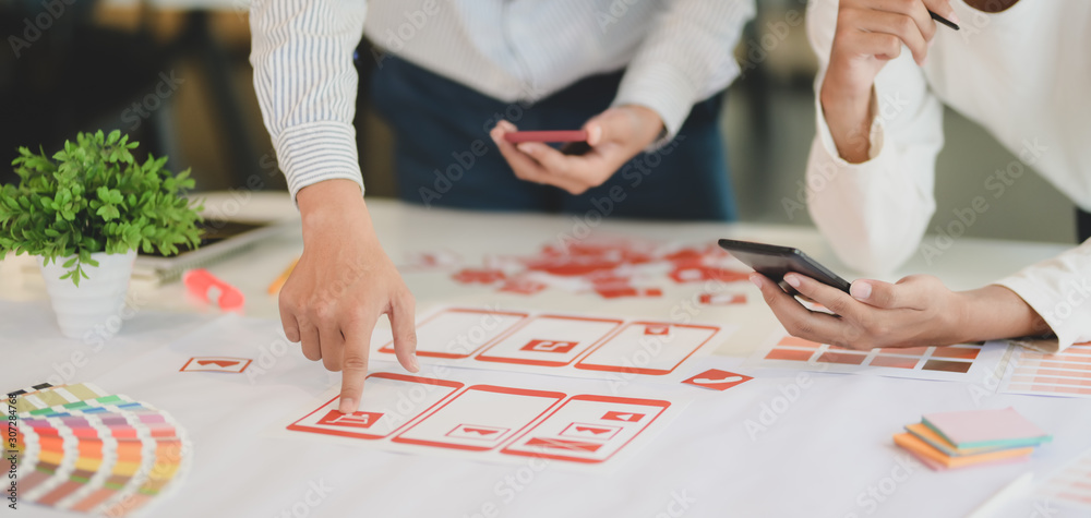 Close-up view of young professional ui app development team discussing the idea about smartphone temWall mural