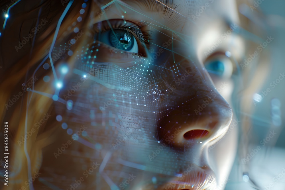 Close-up woman portrait with digital biometric scan - face detection and facial recognition - face id Wall mural