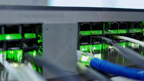 The watermark will not be included on Wall mural.: Closeup 4k video internet network switch multiple ethernet cables plugged showing blinking green lig