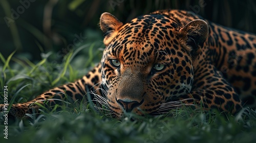 The watermark will not be included on Wall mural.: Closeup of a wild male leopard face resting on grass in forest capturing the essence of wildlife ser
