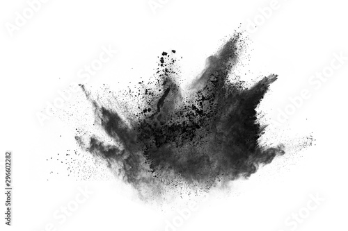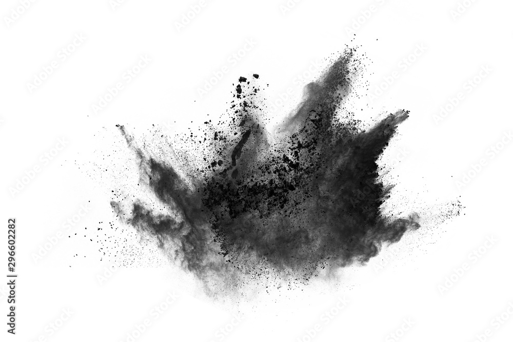 Wall mural : Closeup of black dust particles explode isolated on white background - -