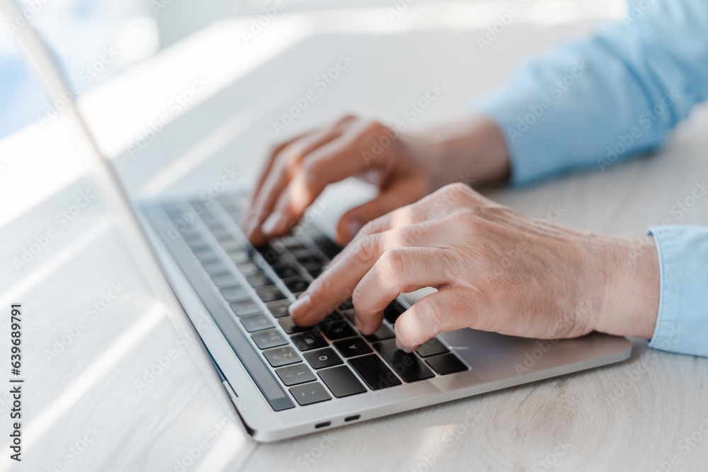 The watermark will not be included on Wall mural.: Closeup of business woman hands using laptop computer, typing on keyboard working freelance project