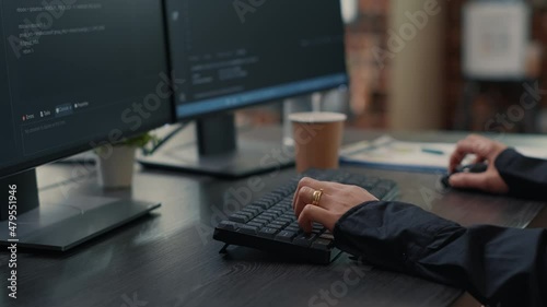 Wall mural closeup of developer hands typing code on keyboard while looking at computer screens with programmin - Wall murals Wall mural closeup of developer hands typing code on keyboard while looking at computer screens with programmin - Wall murals