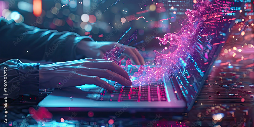 Wall mural closeup of hands typing on a keyboard with digital technology hologram screen, software development  - Wall murals Wall mural closeup of hands typing on a keyboard with digital technology hologram screen, software development - Wall murals