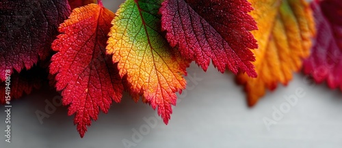 Wall mural closeup of vibrant autumn leaves with gradient hues from green to red and orange on a soft neutral b - Wall murals Wall mural closeup of vibrant autumn leaves with gradient hues from green to red and orange on a soft neutral b - Wall murals