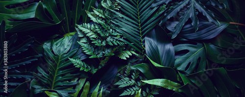 Wall mural : Closeup tropical green leaf background - flat lay, fresh wallpaper banner concept