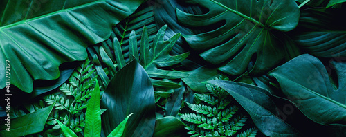 Wall mural : Closeup tropical green leaf background - flat lay, fresh wallpaper banner concept