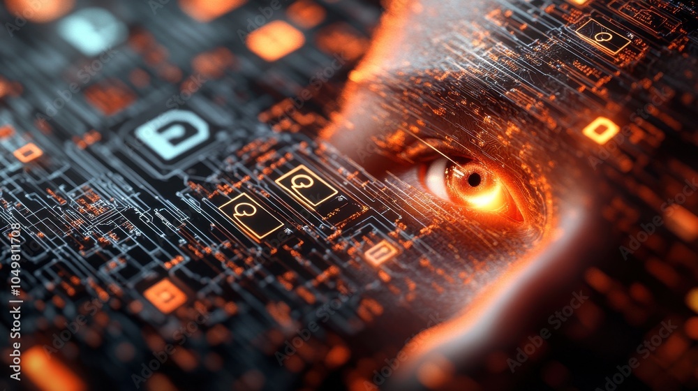 Wall mural : Closeup view of a futuristic circuit board with a captivating cybernetic eye monitoring the intricat