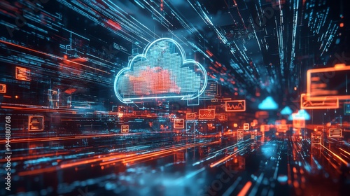 Wall mural : Cloud computing analytics in action, floating digital dashboards with real-time data graphs, surroun