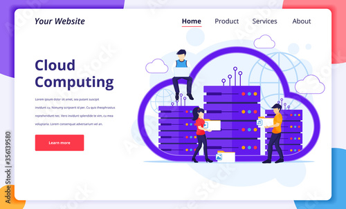 Wall mural cloud computing concept, people working on laptop and server, digital storage, data center. modern f