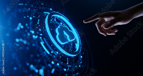 Wall mural cloud computing concept. human hand touching futuristic virtual screen with cloud computing, laptop  - Wall murals Wall mural cloud computing concept. human hand touching futuristic virtual screen with cloud computing, laptop - Wall murals