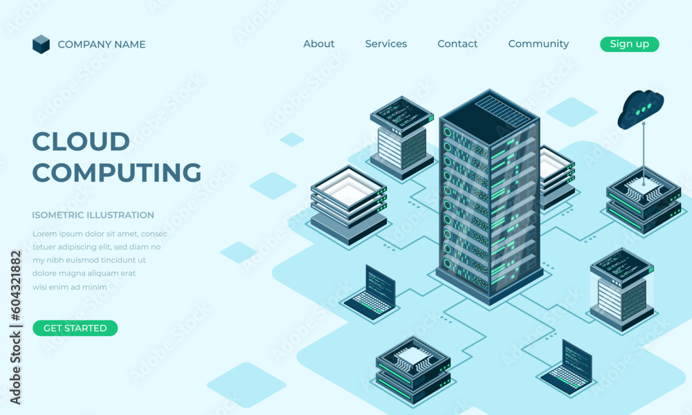 Cloud computing isometric landing page - cloud storage server - cloud computing online database technoWall mural