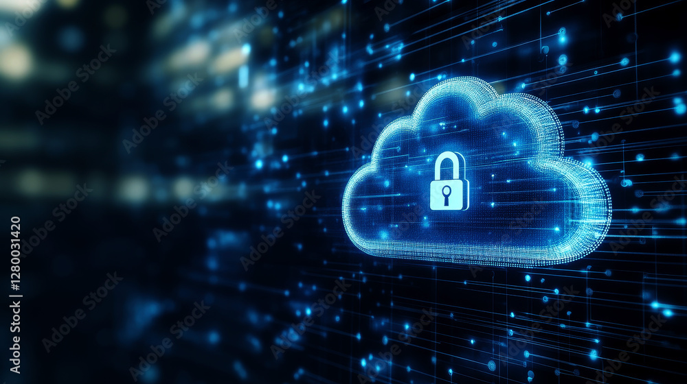 Wall mural cloud computing security. cloud with padlock icon on dark background. concept of data protection, cy - Wall murals Wall mural cloud computing security. cloud with padlock icon on dark background. concept of data protection, cy - Wall murals