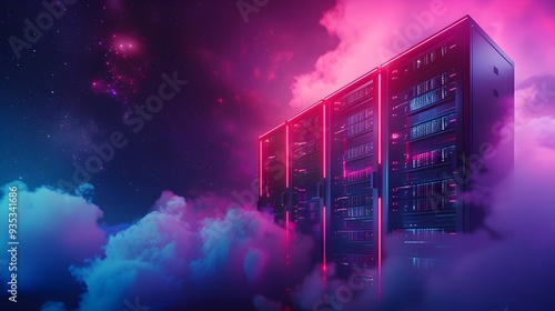 The watermark will not be included on Wall mural.: Cloud computing server data center with vibrant neon lights and detailed high tech design