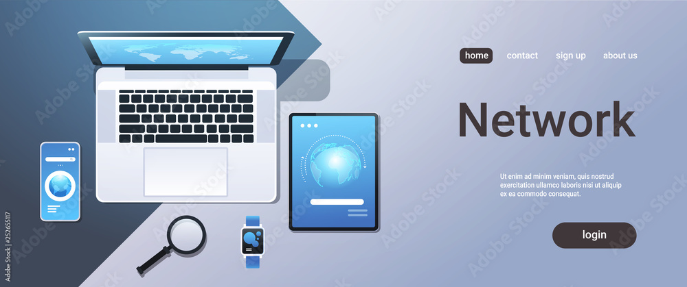 Wall mural cloud computing technology network sync concept top angle view desktop laptop smartphone tablet smar - Wall murals Wall mural cloud computing technology network sync concept top angle view desktop laptop smartphone tablet smar - Wall murals