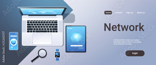 Wall mural cloud computing technology network sync concept top angle view desktop laptop smartphone tablet smar