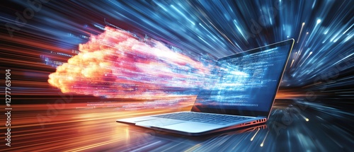 Wall mural : Cloud computing technology with a laptop sending files to a cloud server, representing the efficienc