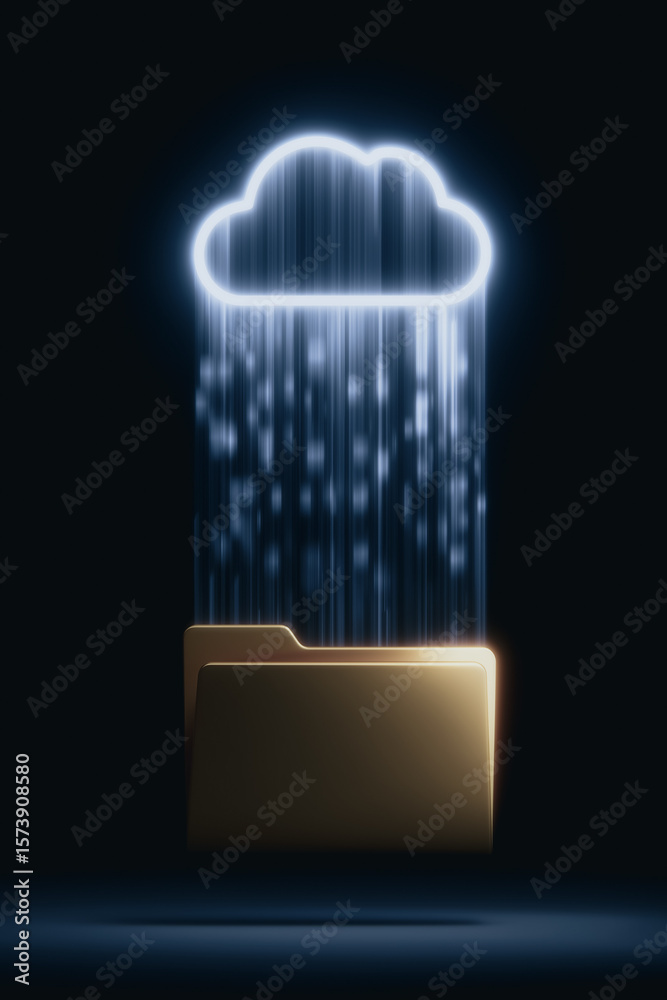 Wall mural cloud data flow: a digital rendering showcases data pouring down from a luminous cloud into a golden