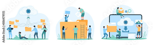 The watermark will not be included on Wall mural.: Cloud data storage service set - tiny people put digital document in folder, work with cloud director