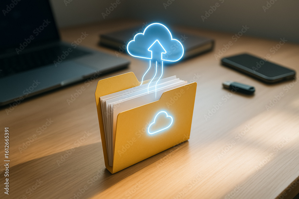 Wall mural : Cloud upload concept: a vibrant digital concept showcases data files being seamlessly uploaded to a