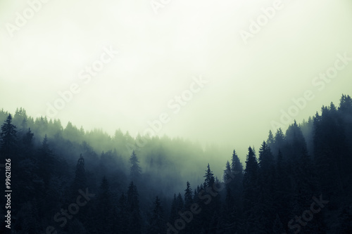 Wall mural clouds and fog over pine tree forest