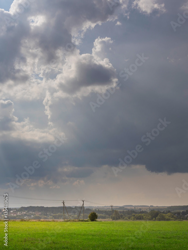 The watermark will not be included on Wall mural.: Cloudy sky with a tree in the middle of the field