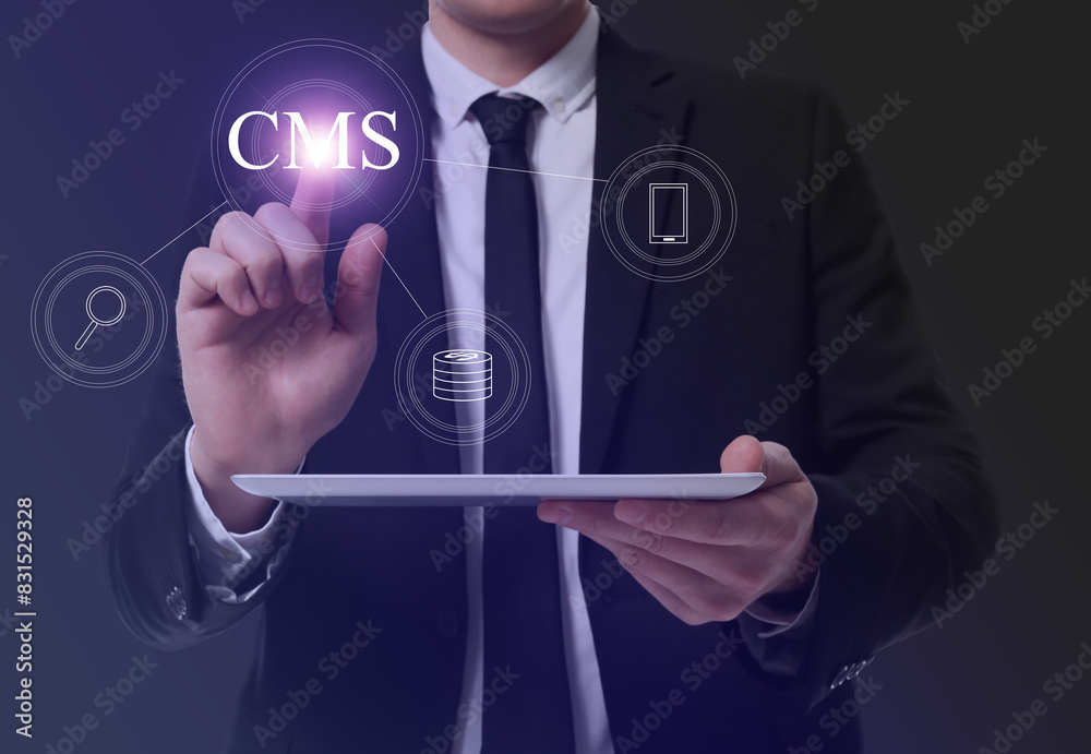 Cms - man with tablet using virtual screen, closeup - scheme with icons on dark backgroundWall mural