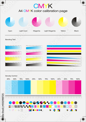 Cmyk color calibration page in a4 format - includes banding tests, ink density control (25% to 100%),Wall mural