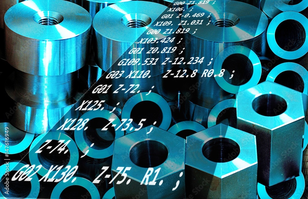Wall mural cnc programming concept. different metal pieces produced by one running program in g-code. - Wall murals Wall mural cnc programming concept. different metal pieces produced by one running program in g-code. - Wall murals