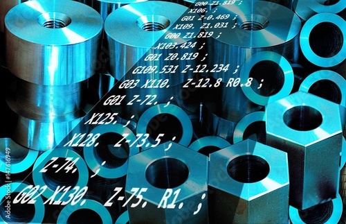 The watermark will not be included on Wall mural.: Cnc programming concept - different metal pieces produced by one running program in g-code -