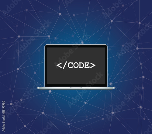 Wall mural : Code icon on screen of the laptop with blue background dot connected vector graphic