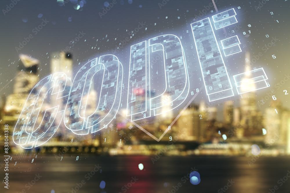 Wall mural code word hologram on blurry cityscape background, artificial intelligence and neural networks conce