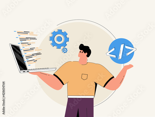 Wall mural : Code - a young man sits with laptop writing code - the concept of coding and programming - scenes from