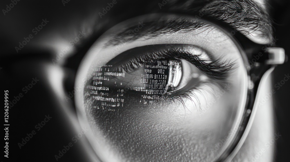 The watermark will not be included on Wall mural.: Coder's eye reflecting code at night, cybersecurity