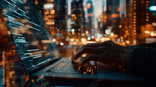 The watermark will not be included on Wall mural.: Coder's hands typing code on laptop at night -