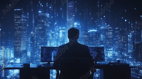 Wall mural coder, night city, data streams, work - Wall murals Wall mural coder, night city, data streams, work - Wall murals
